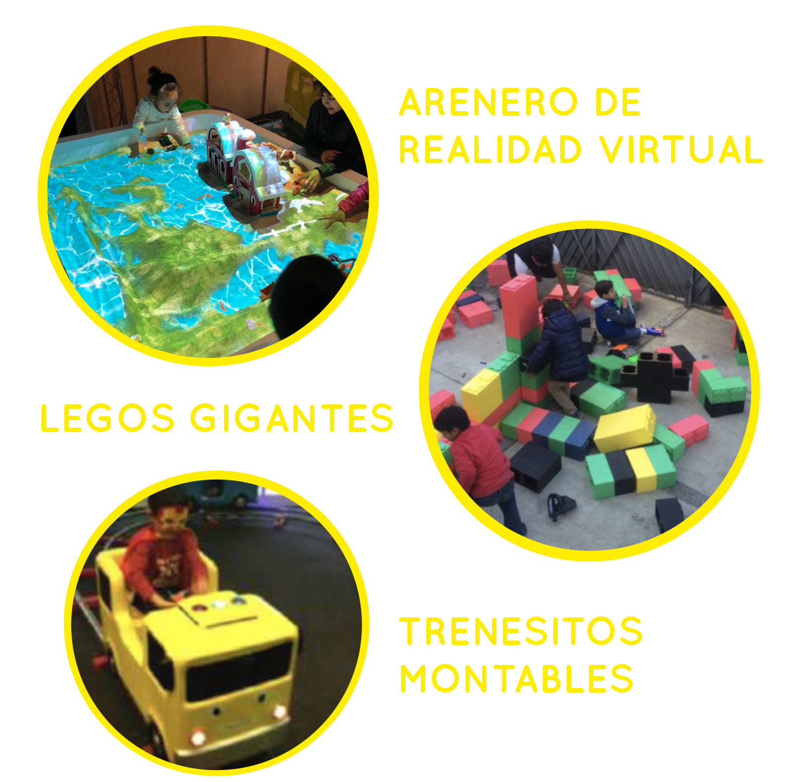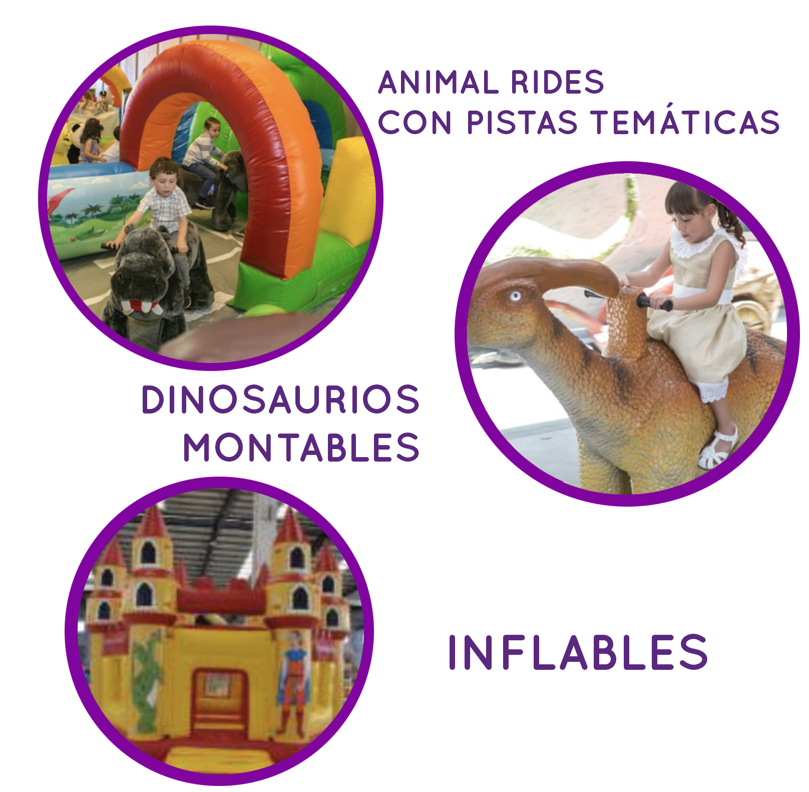 Diferentes juegos desde inflables, tren, juegos de realidad virtual, Legos Gigantes, Animal Rides, Pistas para Rides.